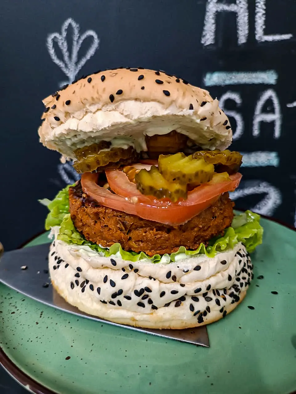 Pão com gergilim, burguer de soja ou grão de bico, maionese vegana, molho da casa, tomate, picles agridoce, cheddar & rúcula.